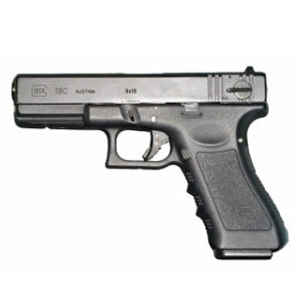 A Pistola Glock G-18 9mm é uma variante do modelo G-17 mas com característica que diferencia de sua irmã, ela possui uma chave seletora de tiro que permite que a arma efetue tiro em fogo automático (rajada).