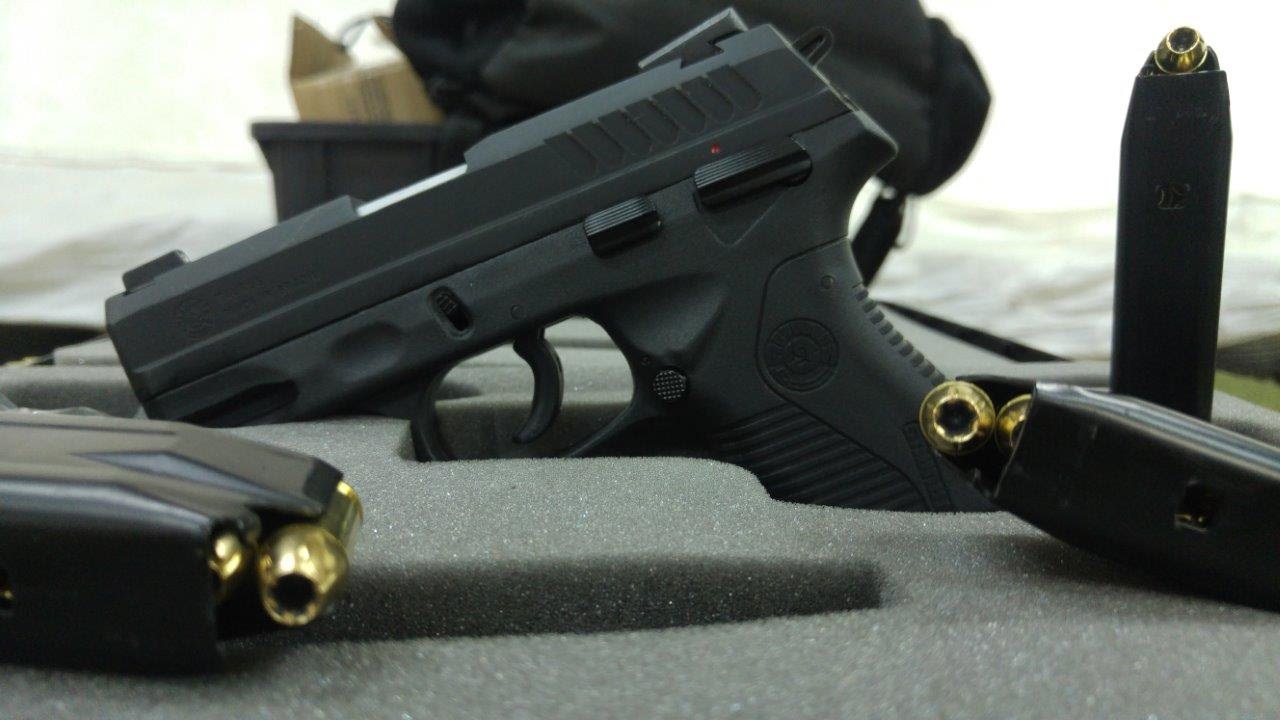 | Ficha Tcnica | Armação e empunhadura em polímero de alta resistência. Empunhadura com entalhe para os dedos e grip filetado para melhor aderência na empunhadura e visada. Ferrolho e cano em aço carbono oxidado (preto). Possui trava de segurança e desarmador do cão ambidestros (pode ser usada por destros e canhotos). Indicador de cartucho na câmara mostra quando a arma está com a “bala na agulha”. Trilho universal sob o cano, à frente do guarda-mato, para uso de acessórios táticos. Comprimento do cano: 108 mm (10,8 centímetros). Comprimento total da arma: 196 mm (19,6 centímetros). Peso da arma desmuniciada: 790 gramas. Fabricação Nacional: Forjas Taurus S.A |