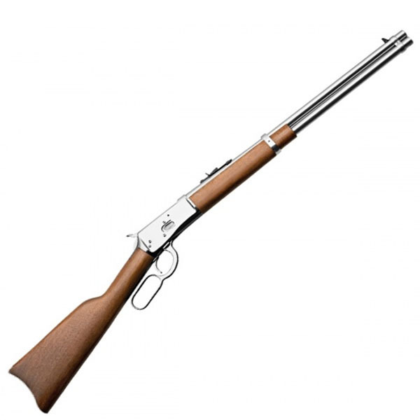 Carabina de ação por alavanca, com ferrolho de duplo trancamento, percursor flutuante e cão exposto. Coronha em madeira de lei, tratada contra fungos e encerada. Soleira em aço, vértice de mira regulável em altura, carregador tabular sob o cano. Arma inspirada nas clássicas carabinas Lever Action americanas. Edição especial, carabina exclusiva Rossi com octagonal e culatra e soleira latonados.